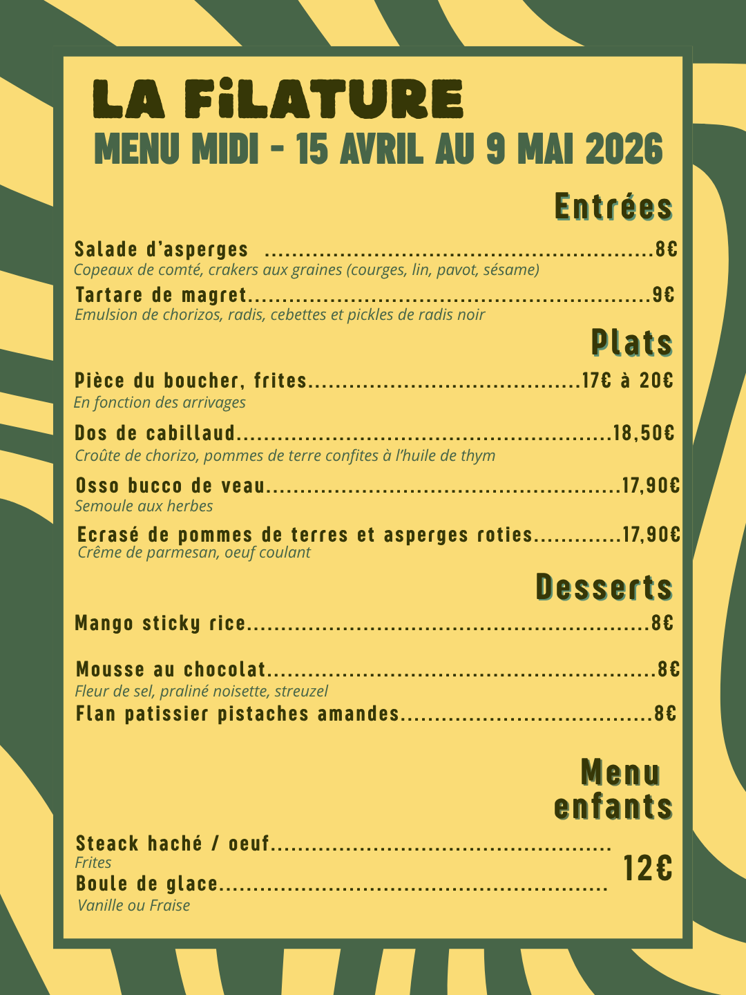Notre carte est renouvelée toutes les 3 semaines environ, et reste assez réduite pour préserver la qualité des produits.